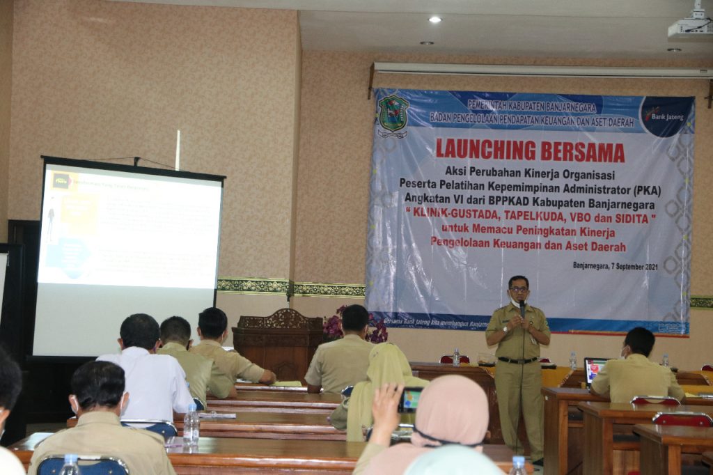 BANJARNEGARA – Badan Pengelolaan Pendapatan, Keuangan dan Aset Daerah (BPPKAD) Banjarnegara melakukan launching Aksi Perubahan Kinerja Organisasi, berupa empat inovasi sekaligus. Keempat inovasi tersebut adalah : “GUSTADAâ€, “TAPELKUDAâ€, VBO†dan “SIDITA†yang kesemuanya bertujuan untuk memacu peningkatan kinerja pengelolaan keuangan dan aset daerah. Launching berlangsung di aula BPPKAD Kabupaten Banjarnegara. Selasa, (7/9/2021) ditandai dengan pemotongan tumpeng oleh Sekda Drs. Indarto M. Si, dilanjutkan dengan paparan oleh masing-masing pejabat penggagas inovasi tersebut.