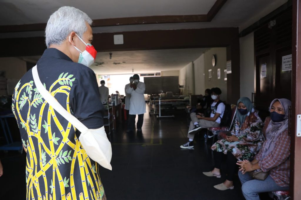 “Pripun kabare bapak ibu? Ada yang ngreges-ngreges tidak? Batuk, pilek atau hilang penciuman?,” sapa Ganjar pada puluhan pasien yang ada di sana.