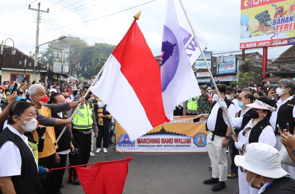 Rombongan Parade Waisak bergerak dari Candi Mendut menuju Candi Borobudur setelah dilepas secara langsung oleh Gubernur Jawa Tengah, Ganjar Pranowo dan Ketua Walubi, Murdaya Widyawimarta Poo. Ganjar mengikuti prosesi jalan sebentar, kemudian melanjutkan kegiatannya gowes pagi di kawasan Borobudur.