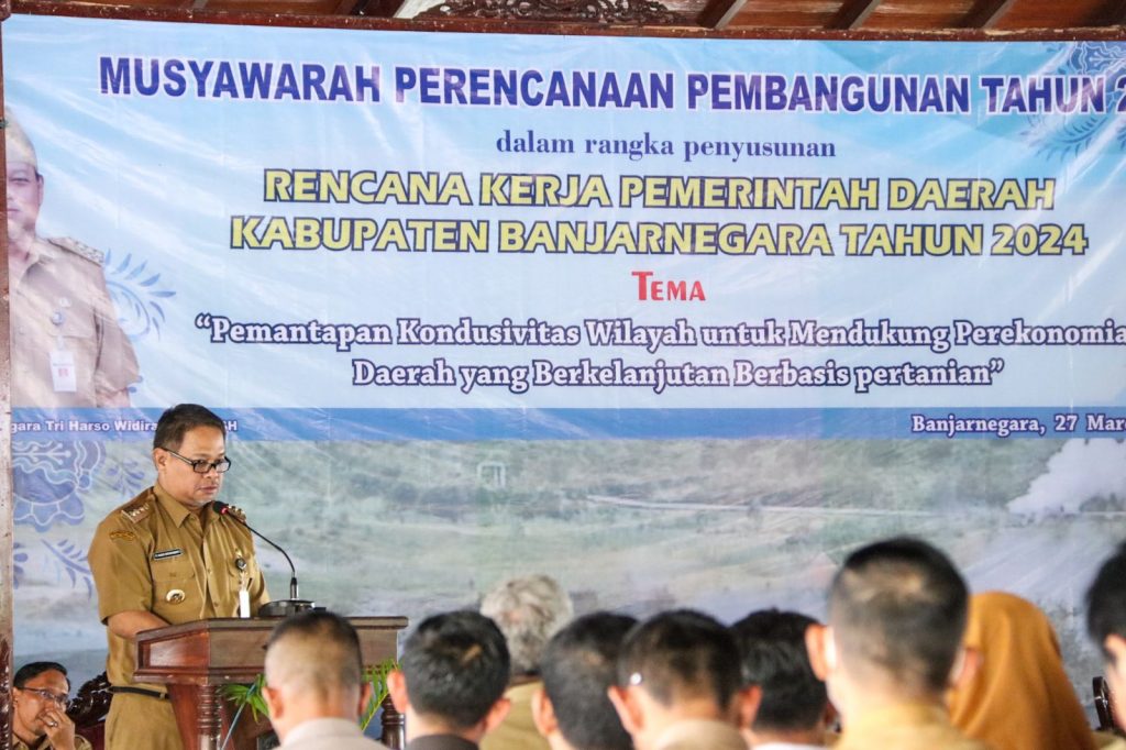 Pj Bupati Banjarnegara Tri Harso Widirahmanto menyampaikan tema rancangan RKPD Kabupaten Banjarnegara Tahun 2024 adalah pemantapan kondusivitas wilayah untuk mendukung perekonomian daerah yang berkelanjutan berbasis pertanian.