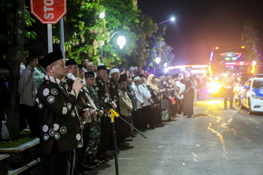 Pj Bupati Banjarnegara, Tri Harso Widirahmanto bersama jajaran Forkopimda melepas 355 jemaah calon haji kloter SOC 77 di Pendapa Dipayudha Adigraha, Jumat dini hari (16/6).