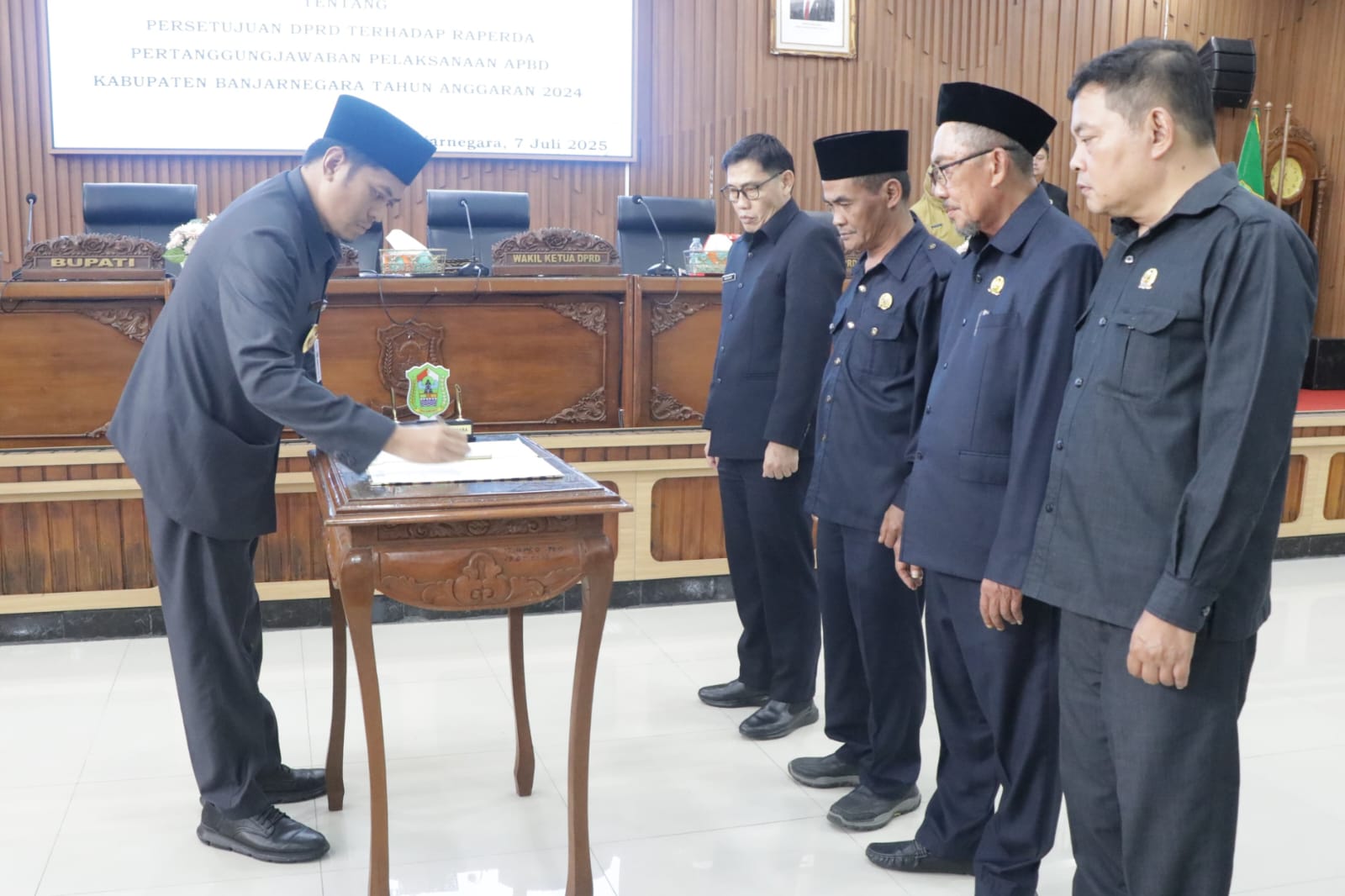 Agenda rapat selanjutnya di lakukan dengan penandatangan hasil Persetujuan Raperda Pertanggungjawaban Pelaksanaan APBD Tahun Anggaran 2024 oleh Wakil Bupati Banjarnegara H. Wakhid Jumali Lc.yang mewakili Bupati Banjarnegara dr Amalia Desiana. Kemudian juga oleh Ketua dan Wakil Ketua I, II, dan III DPRD Kabupaten Banjarnegara.*(kominfo_dhis).